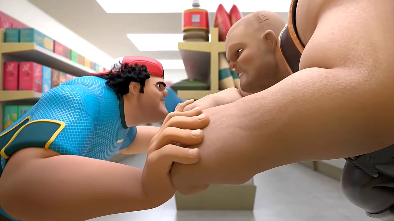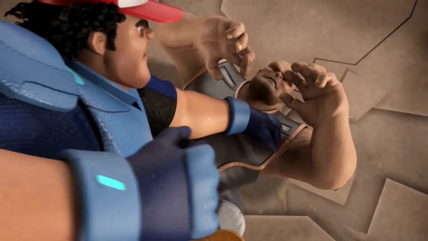 Bakar bangun semula dan menyuruh Ali melarikan diri. Dos menyuruh Trez menahannya, tetapi Trez enggan kerana ingin fokus pada "si gemuk" itu - satu gelaran yang tidak disenangi Bakar yang menggelar dirinya tough. Maka bertarunglah Bakar seorang diri dengan dua penyangak itu. Trez menghentam tanah untuk menghasilkan gelombang kejutan untuk menggoyahkan Bakar sementara Dos melompat untuk mengelak. Dos melemparkan Shox Stix ke arah muka Bakar tetapi Bakar sempat menangkapnya. Trez mengasak Bakar dari belakang dan cuba menumbuk; Bakar mengelak, menyebabkan Trez tertumbuk tiang. Pada masa yang sama, Ali berlari turun tangga tetapi terjatuh dan tersungkur. Tabletnya tercampak keluar dari beg; Ali memandang tabletnya dan teringat tentang pesanan Viktor di tandas.