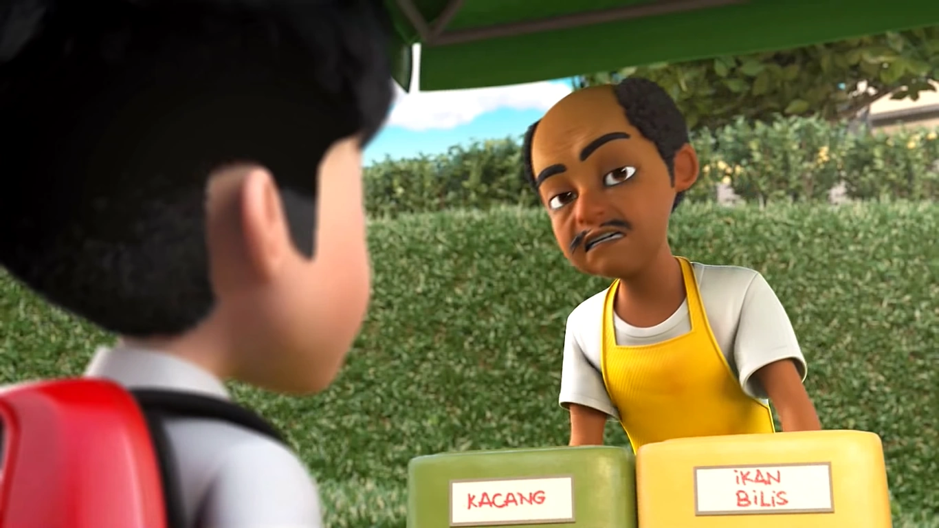 Sementara itu, Dos tiba di gerai Nasi Lemak Cyber dan meletakkan alat yang dicurinya ke dalam kotak hijau dengan meninggalkan kata laluan "Tempoyak Udang". Ali menuruni tangga dan hampir melanggar seekor kucing putih dan gerai Nasi Lemak Cyber, tetapi sempat berhenti. Ali menempah nasi lemak dengan meminta lauk "Tempoyak Udang", membuatkan Wak Musang terkejut lalu memberikan kotak hijau yang mengandungi alat itu kepadanya tanpa mengenakan bayaran. Ali kemudian bergegas ke sekolah selepas mendengar bunyi loceng sekolah, menandakan kelas telah bermula dan dia terlambat. Beberapa saat kemudian, seorang lelaki serba hitam datang ke gerai Wak dan meminta "Tempoyak Udang". Ini menyedarkan Wak yang dia dah tersalah orang.