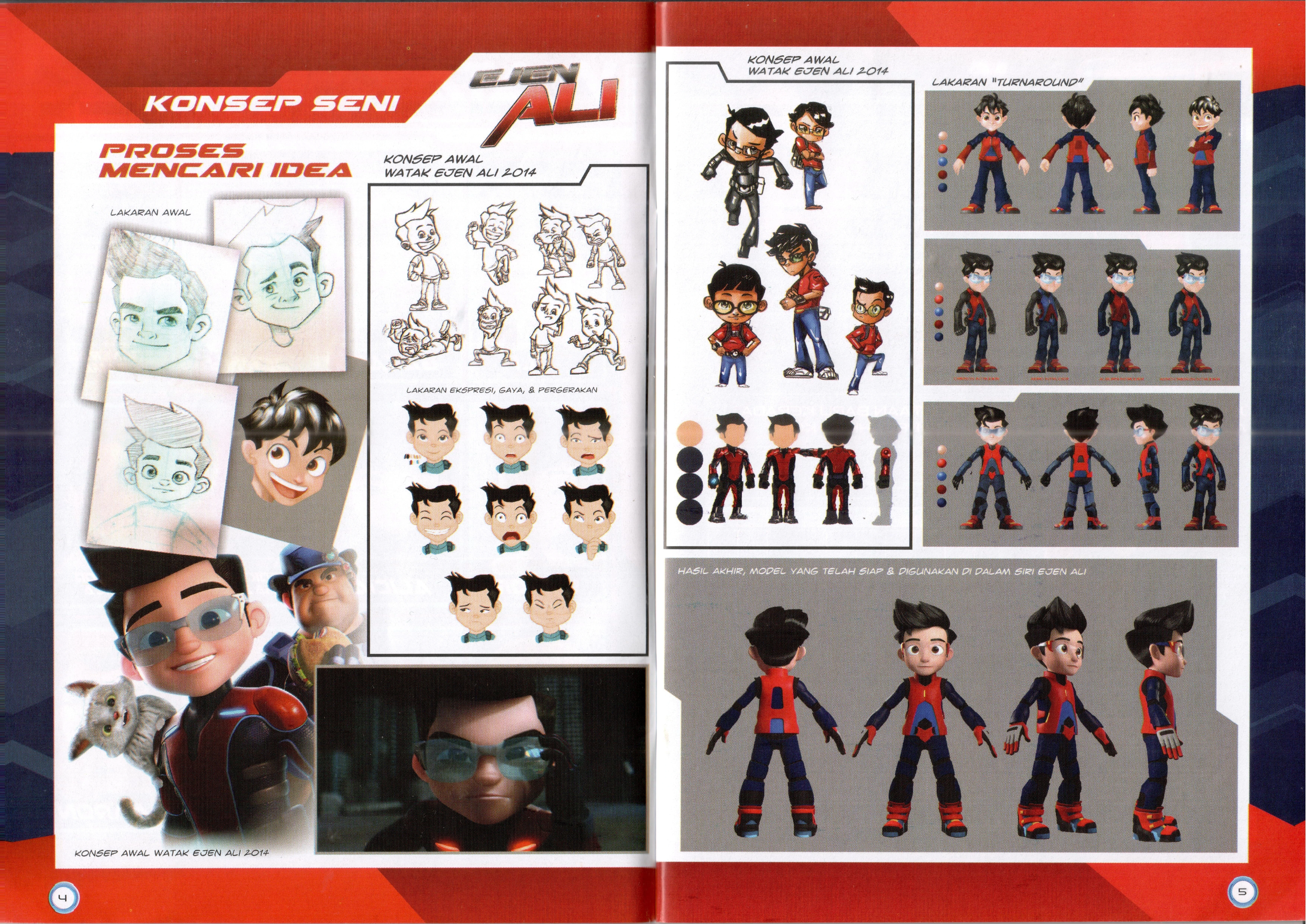 Armed: Ali used his armed device (Slingshot) to shoot the sentry guns in the 2nd teaser ("KECEMASAN!"). At the time, Alicia's character had not been created yet, and once they secured her as a main character they armed her with a slingshot and had to find another weapon for Ali. The director of Ejen Ali got inspired to equip Ali with a high-tech yoyo when he watched a Facebook video of a kid playing with one.