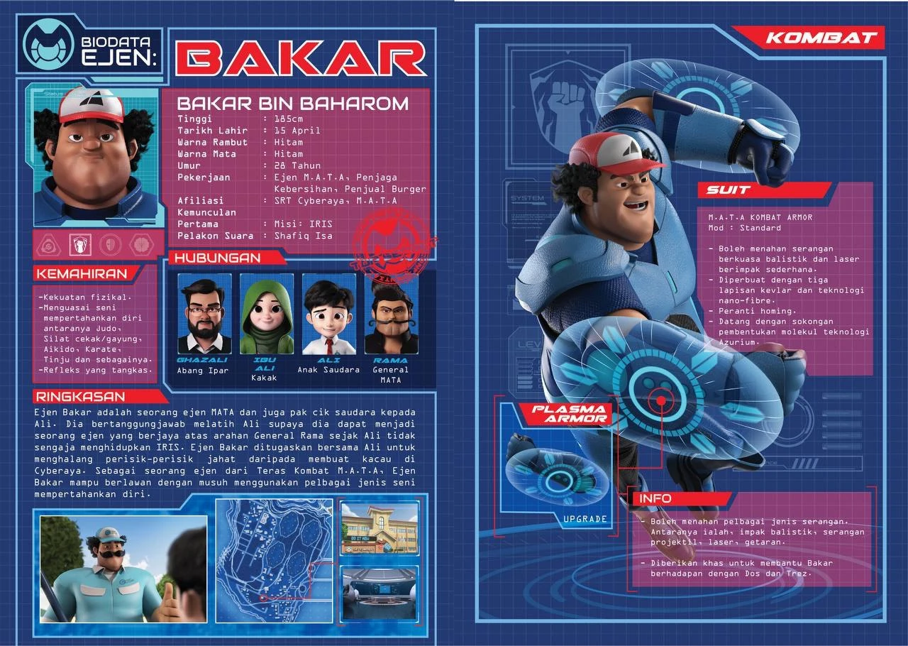 Dos and Trez sneaked into one of M.A.T.A. base, and Bakar happened to be one of the agent working there that night. Dos ran into Bakar, and Bakar stopped her and gave her one of his cringy pickup line. Bakar claimed he knew everyone in the base, so he assumed Dos is a new agent assigned to the base, unaware that she was there to steal I.R.I.S.. Bakar was too late to stopped her from escaping, and thought to himself “he’s done for” for losing I.R.I.S. under his watch. He tried tracking I.R.I.S. down, and found the signal to stopped at S.R.T. Cyberaya 1. He reunited with Ali, who he thought is now 9 years old. Bakar followed Ali to a nearby convenience store, but his suspicious behaviour makes Ali confused. Bakar asked Ali if he has taken something by mistake, to which Ali denied. Bakar told Ali he’s in danger, and told him to run away while he stall Trez. Ali got captured by Dos, and Bakar arrived to save him. Ali tried to run away with I.R.I.S., but felt bad about leaving Bakar behind so he came back and synchronised I.R.I.S. to himself. Ali passed out from draining his energy via I.R.I.S., and Dos and Trez ran away as backups is arriving soon. Bakar took Ali to one of M.A.T.A. base, where Bakar, General Rama, and Jenny discussed about Ali’s fate now that he has locked I.R.I.S. to himself. General Rama told Ali he now belonged to M.A.T.A., and will be made into an agent until they figured out a way to separate I.R.I.S. from him. Since then, Bakar went on missions with Ali, accompanied by Alicia, Rizwan, and Comot. After Ali disobeyed a “Protokol Gegas” order, he was suspended for a little while and Rizwan took over and trained Ali, making Bakar felt lonely and jealous over Rizwan’s role in Ali’s life. While chasing validation, Ali created a Waubook social media account using his agent identity, making Bakar mad at him for endangering his life and missions, and forcefully told Ali to delete it. Ali refused and in the heat of the moment, told Bakar that he’s not the one making him cool, it’s Rizwan. Bakar later helped Ali save Viktor who was kidnapped by Abang Bear and Komeng, and having learnt his lesson, Ali deleted his social media account, and tried to tell Bakar and apologised to him, but they were interrupted by General Rama, Rizwan, and Jenny, who arrested Bakar and accused him of being a mole to the enemies. When Numeros invaded M.A.T.A. base for I.R.I.S., Comot helped released Bakar from his cells, and he went straight to save Ali from Numeros, but was injured badly by Uno. Ali triggered Override Mode, and managed to take down Numeros, but Jenny succeeds in overriding one of the droid manually to stop Ali and separate I.R.I.S. from Ali. Alicia arrived with Comot and saved Ali and Bakar from being buried in rubbles. Back at Ali’s home, Bakar waited for Ali to wake up, and they apologised and made amend with each other. Bakar told Ali about the aftermath of Numeros invasion. Later, they returned to the base for one last report from General Rama, and Bakar prompted General Rama to tell Ali about M.A.T.A. Academy. Ali took his one last look at I.R.I.S., but due to his clumsiness, accidentally synchronise I.R.I.S. to himself again, making General Rama really angry at him.