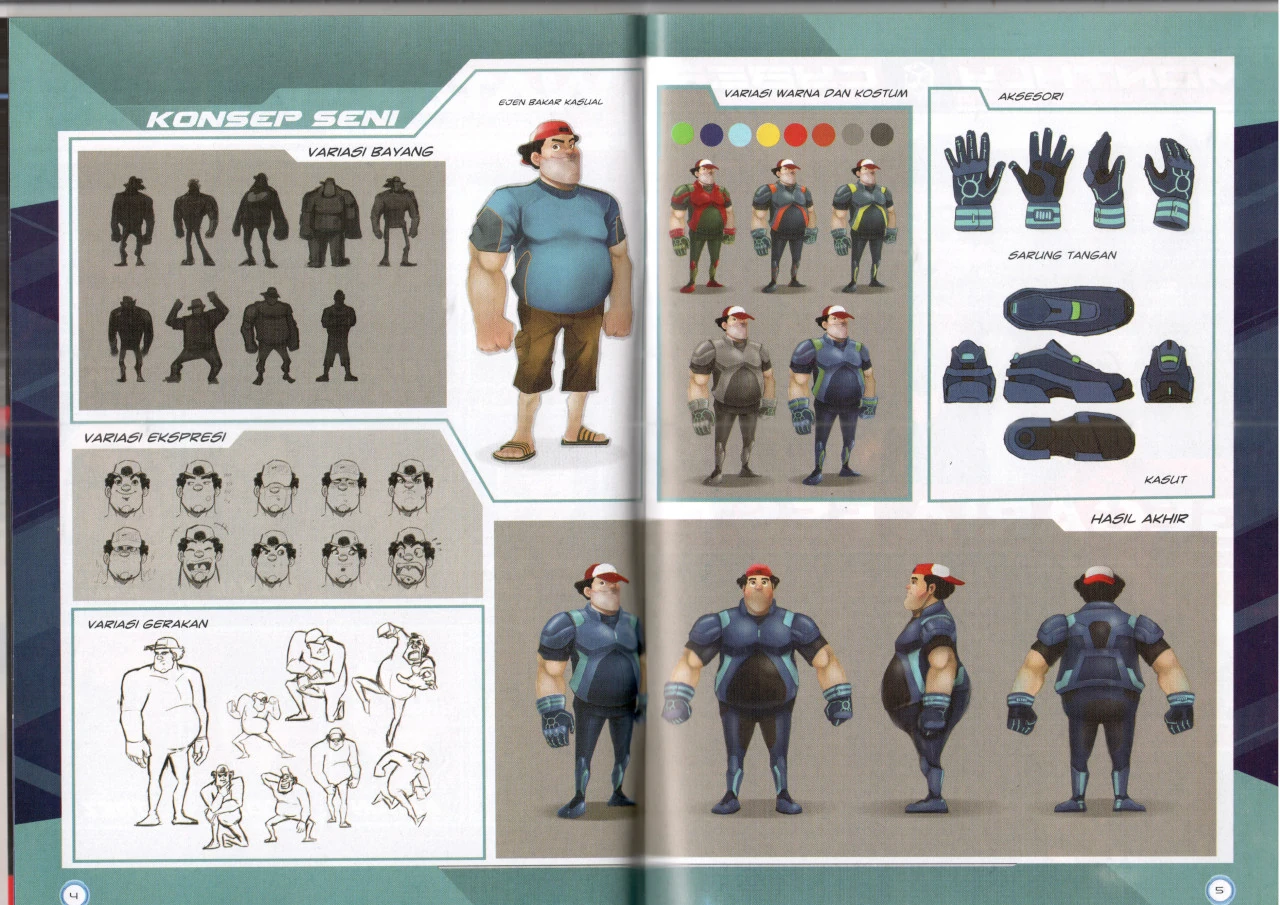 Bakar usually sported a red-and-white baseball cap. He wore it to the front during mission, and wore it backward when not in mission. He usually wears a heavy blue Combat suit that can withstand and tanked most attacks, and his main gadget is Plasma Shield, equipped on both of his arm. In his casual outfit, he wears a blue jersey shirt, a short pant that reach until his knees, and a pair of sandals.