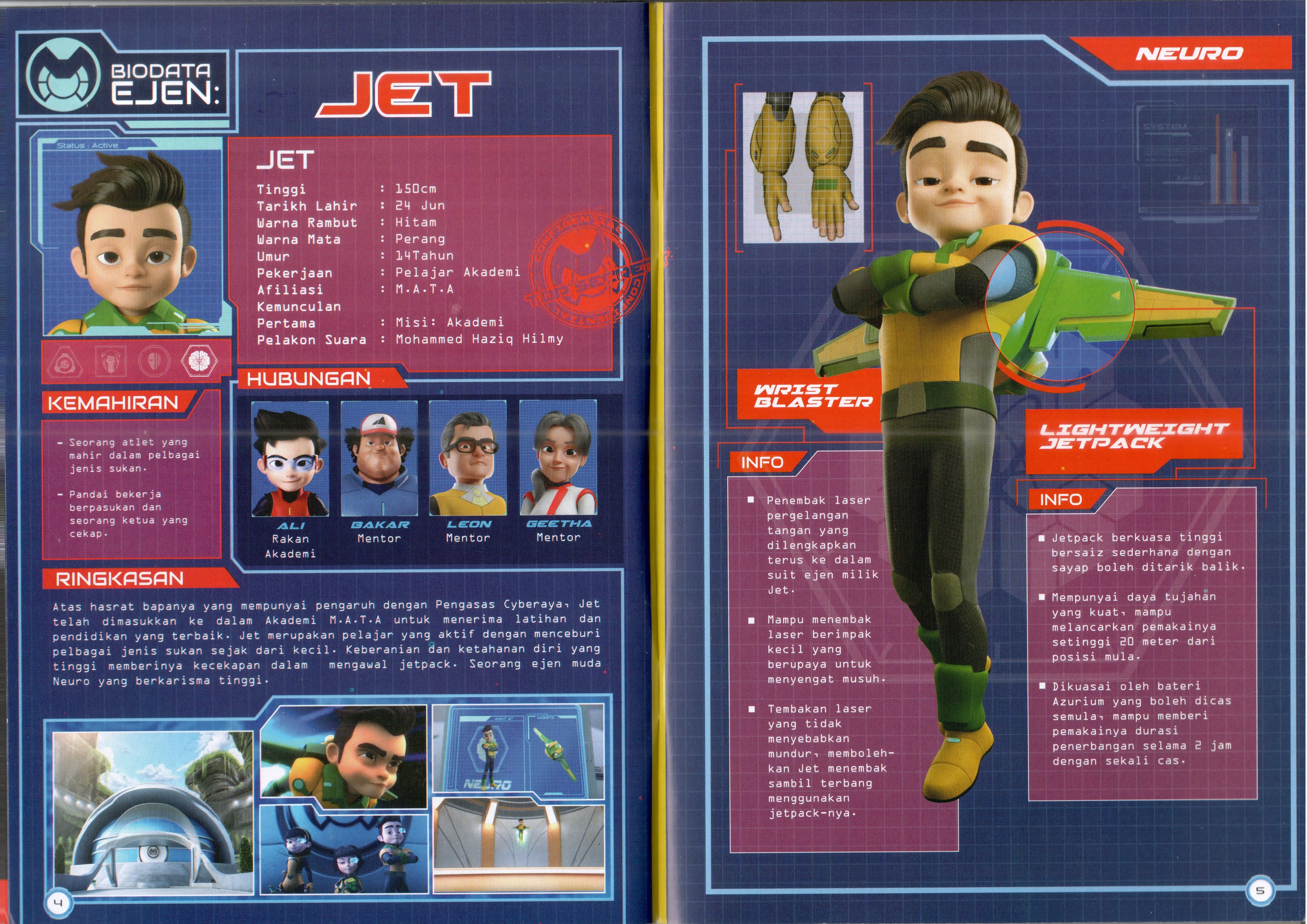 Jet is a charismatic and athletic young NEURO agent under M.A.T.A. Training Academy and is introduced in Agent Ali Season 2. He was the son of a man who has great connection with Cyberaya Innovators (Peneraju). His father wanted the best education for Jet, so he was enrolled into M.A.T.A. Academy to receive the best education and training for him.[1]