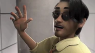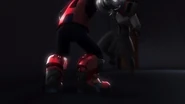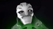 Comot grinned towards the back of the road, warning Ali. A man wearing a black and white striped mask and a black coat appeared, throwing cards at Ali. Ali managed to dodge and try to detect the man's identity but could not because the signal was blocked by the mask. Ali questions the man while taking cover behind a spinning yoyo disk, while Alicia tries to shoot him with a Ballistic, but the bullet is deflected by a card, while another card backfires on Alicia's back. Ali managed to push Alicia aside to survive.