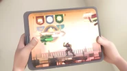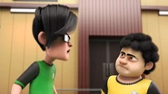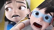 Surprised by the young spy's tenacity, Dos attacks Ali with a series of Plasma Blades but is dodged. Dos leaps and thrusts at him but Ali deflects his blade with a yoyo string and a push of his Aero Boots. Dos praises Ali's improved skills and attacks again, but is interrupted by a slingshot from Alicia who has just arrived. Ali is upset that Comot brought Ali here and not Bakar. Alicia tells Ali to step aside while taking aim, but Ali refuses because he fought Dos before. Alicia claims that Ali is almost defeated, but Ali denies it. The argument between them leaves Dos stunned in surprise. Rizwan arrives to break up the argument by squeezing their necks and telling them not to do anything embarrassing. Ali blames Alicia for the argument.