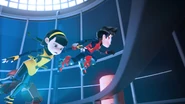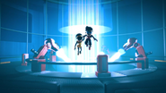 Dos and Trez return to their red-lit headquarters, greeted by a disappointed Dr. Aaron who has failed to bring back the azurium. Asked why, they whine that M.A.T.A. has tracked them down, so they have to abandon the azurium and consider other materials instead. Aaron scolds them that he needs the azurium to work on his upcoming invention. On the big screen, a black board with glowing red eyes appears, questioning Dr. Aaron if everything is okay. Called "Uno", he entertains Dr. Aaron's complaints that Dos and Trez cannot be trusted. Hurt by these words, Trez tries to attack Dr. Aaron, but is restrained by Uno who paralyzes his body from a distance until his veins glow blue because he does not want to be disturbed.